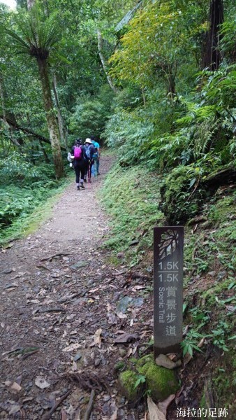 森林浴步道是園區內三條步道中較困難的一條, 走完森林浴步道後有個休息區有可以稍做休息. 然後, 再接賞景步道, 一開始是緩下坡路段, 之後是之字形的石階路段, 有點濕滑, 需小心行走.