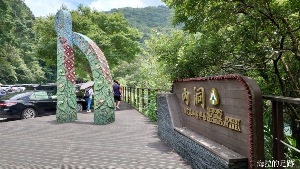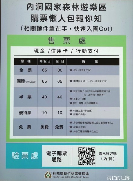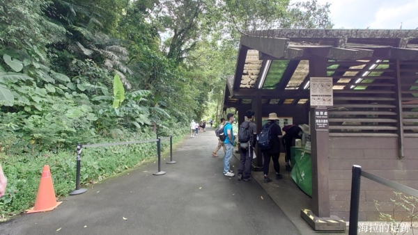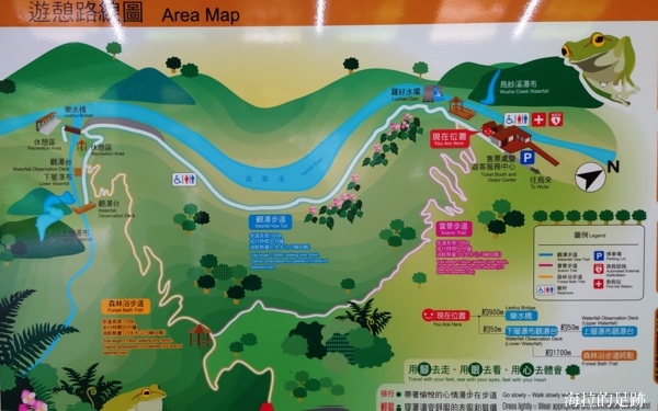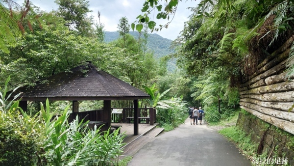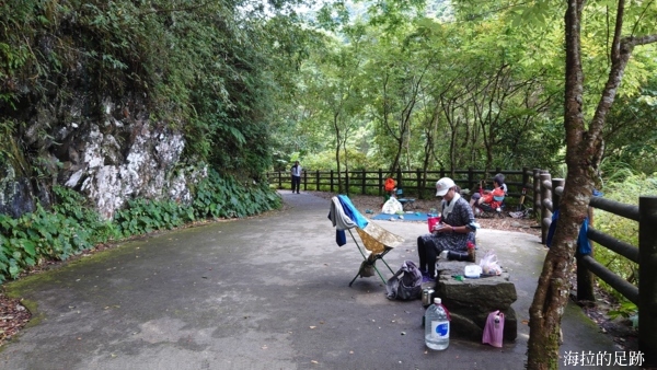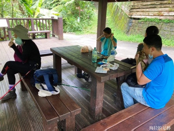行走在信賢步道感覺非常涼爽愜意, 平坦好走的步道很適合全家大小親子遊, 輪椅及嬰兒車也暢行無阻. 走過吊橋後的第一個瀑布是昇龍瀑布, 這個瀑布頗大, 水量豐沛, 許多爸媽帶小朋友在這裡玩水消暑. 瀑布附近也有人野餐或泡茶聊天. 一開始我們還很認真地細數每一個瀑布, 想要把十個瀑布都還全. 但瀑布前面並沒有立牌指示, 有些在岩壁上的小飛瀑, 我們不知是水管爆掉, 還是真的瀑布. 這個有立柱標示是公公瀑布, 但郤看不到潺潺流水, 只有滿眼的綠意盎然. 這裡是信賢步道的另一端, 大部份開車的遊客都把車停在這附近, 從這裡走到另一端的吊橋, 再走回來. 步道這附近有設施完善的公共廁所. 從上圖的步道口走出來後, 就可以看到內洞國家森林遊樂區的指標. 這裡距離售票口還有一小段距離, 但不會很遠. 一樣沿著南勢溪旁的步道前進, 日正當中, 天氣炎熱, 感覺快融化了. 購買內洞國家森林遊樂區的門票有很多種方式, 可以直接到人工售票口購買, 也可以在入口處的門票販賣機投幣購買, 或者採用下圖介紹的電子購票通路購買. 售票處週邊有乾淨的廁所, 飲水機及座位休息區. 入園後還需填寫資料給園區做為購買平安險使用. 這裡有路線圖及目錄可以參考, 還有飲水機可以補水. 內洞國家森林遊樂區內有以下幾條步道, 從進入園區開始, 逆時針方向走一圈, 也是我們今日抓寶的路線. 觀瀑步道-1000公尺, 步行時間30分鐘, 消耗熱量41大卡 (1/7碗白飯) 森林浴步道-1700公尺, 步行時間50分鐘, 消耗熱量123大卡 (2/5碗白飯) 賞景步道-1500公尺, 步行時間50分鐘, 消耗熱量102大卡 (1/3碗白飯) 一進入園區, 我們馬上開啟健行筆記裡的“新北-臺灣百大必訪步道”任務, 開始執行抓寶任務. 園區內的第一個瀑布是烏紗溪瀑布, 烏紗溪為南勢溪支流, 因水流量較主流南勢溪小, 河床侵蝕下切速度較慢, 使得烏紗溪河床與南勢溪間的落差越來越大, 進而在匯流處形成烏紗溪瀑布. 看完烏紗溪瀑布, 來到第一個涼亭, 大家在這裡歇腿吃午餐, 從早上9:57開始從烏來總站下車走起到現在12:59, 走了3個小時, 終於找到好地方可以好好休息用餐. 端午節快到了, 大尾帶了他們公司生產的粽子讓大家享用.