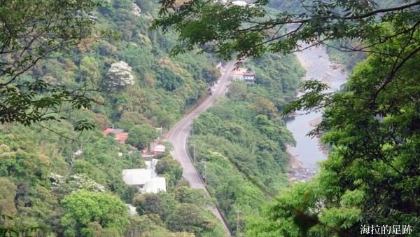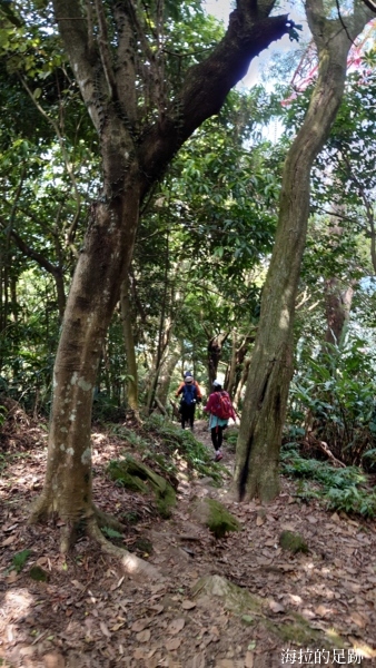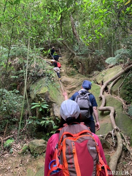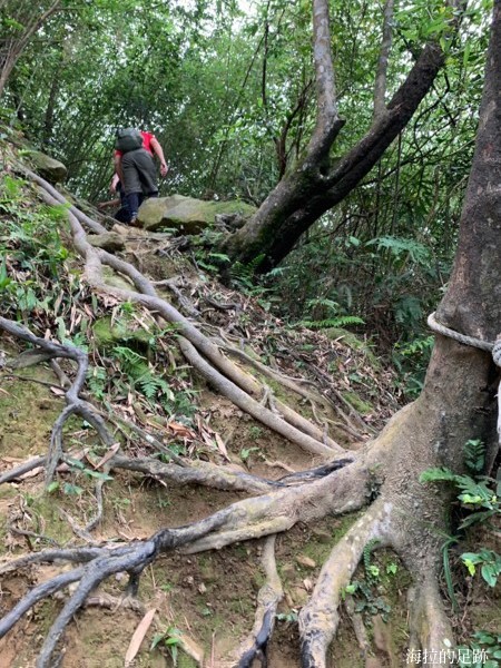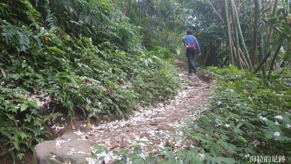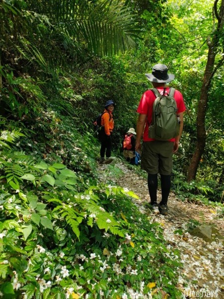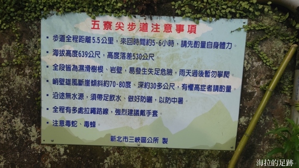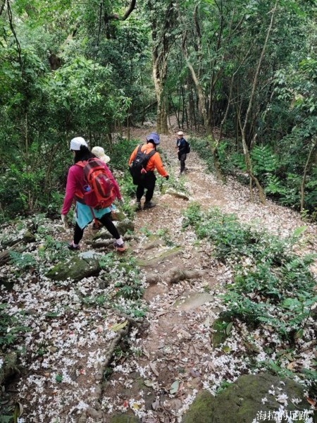 從登山口開始就陡上, 走了幾段石階步道後轉為原始土徑. 現在是桐花時節, 地上舖滿了桐花花瓣, 非常的浪漫美麗. 可能大家都想要早早征服五寮尖, 這裡沒有山友或遊客有閒情逸緻用桐花排字或愛心等圖案. 沒想到土徑走沒多久, 就開始出現拉繩路段. 海拉在來之前當然有先做功課, 也知道五寮尖有很多地方需要拉繩, 還有陡峭的山壁及仿佛遺世獨立的高峰, 但沒想到這麼快就面臨了, 而且還一個接著一個, 令人無法喘息. 大家記得帶上手套啊~~ 我們就這樣連續不停的上上下下, 能夠不依賴繩子的地方, 海拉都儘量抓樹根或岩石.