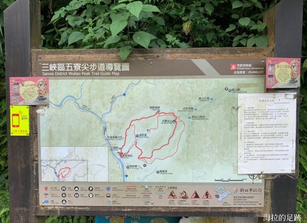 健行筆記的抓寶路線跟登山口的導覽圖路線一樣, 我們打算走一個小O (下圖紅色粗線的路線), 大家的目標是儘早下山到三峽吃午餐.