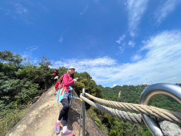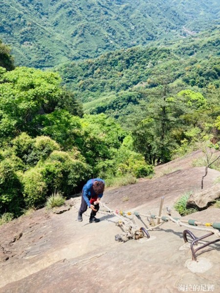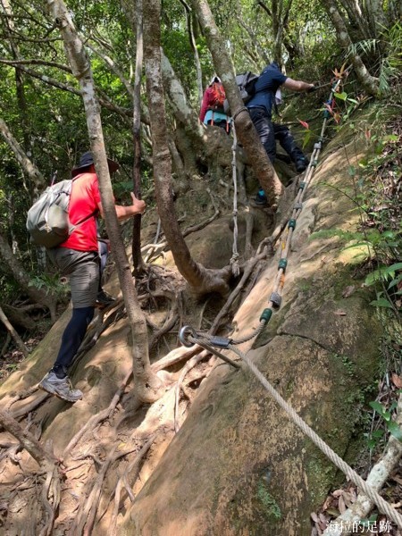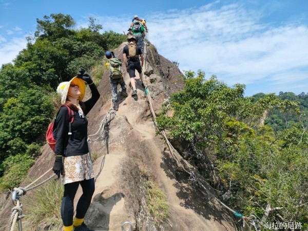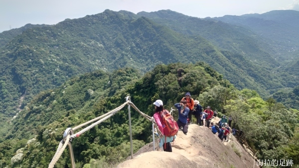 五寮尖路線混亂, 且不停的上上下下, 幸好沿途都有指標及地圖, 我們也都有下戴離線地圖, 有時真的搞不清楚時, 附近也都有熱心山友指路. 接下來的這個窄門, 原本以為下去後就開始一路往下, 沒想到陡下的拉繩攀岩真得很令人心累. 繩子只有一條, 當別人在拉時, 千萬不要急著去拉, 免得被繩子打到, 二人同時拉繩, 容易互相干擾, 容易同時摔倒. 終於來到最刺激的峭壁雄風, 這裡也是最塞人的地方. 站在這裡可以清楚地看到五寮尖山頂矗立在右前方, 而獨立峰則靜立於左手邊.