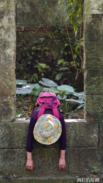 第一階, 第二階沒問題, 中間那個跨距太大,海拉的小短腿跨不過去, 只好用膝蓋頂著石頭, 雙手用力地往上拉繩, 在把另一腳努力地晃上去. 媽呀~~還真得使勁吃奶的力氣. 到了上面之後, 二隻手臂不停地抖啊抖, 真素累死寶寶了. 看來~~需要來去上個攀岩或抱石的課程.