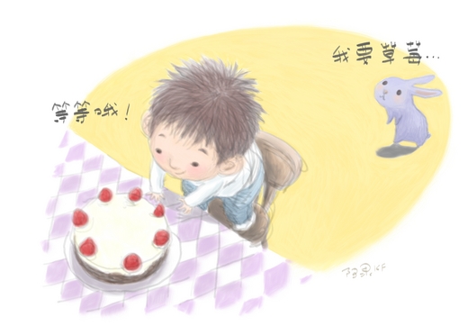 “我要草莓,最大的那顆。” “等等哦……” “我不要鮮奶油,太胖了,都快跳不動了。” “粘到一點點可以嗎?” “一點點可以。” 那天,小胖和虛構的小胖兔一塊偷吃了媽媽剛裝飾好的下午茶蛋糕。 小胖和小胖兔,誰吃了草莓,誰吃了奶油,都一樣滿足。 小胖每回上演偷吃下午茶蛋糕的犯罪藝術,都得邀請小胖兔來壯膽。 只是有時小胖兔瘦了,就可以吃奶油;有時又胖了,就只能吃櫻桃、草莓或芒果。 |