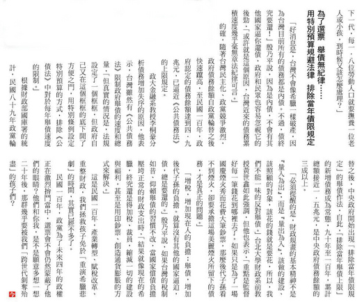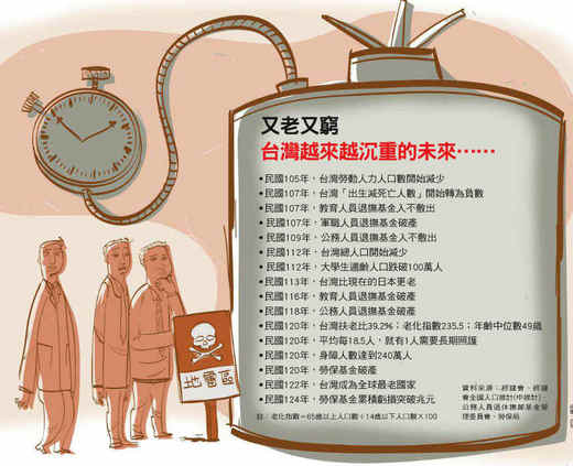 我們孩子受衝擊的年代 ============================= 民國 120 年 【撰文 / 楊紹華 出處 / 今周刊 777 期】 想想有一天,台灣每4人就有1人超過65歲,勞保、公務員退休金破產、房地產崩盤、年輕人將被加稅與國債壓垮……這不是危言聳聽的預言,而是正在發生的事 實!經濟不振、稅收不足、財政惡化、債務破表,這是未來20年,台灣即將面對的四大地雷。屆時,國家債台高築、老人領不到退休金、年輕人必須承受劇... 民國一二○年的這一天,我四十八歲,忽然感覺,這個國家的每一個人,不管是哪一個世代,都正被趕盡殺絕!對未來充滿了失望與憤怒! 透過電視畫面,我看到念大學的兒子走在示威遊行的隊伍中。這場遊行的主軸,是抗議政府日前宣布的加稅措施──經過連續三十三年財政赤字之後,「一次到位」的劇烈加稅,正要落在我們肩頭上。 這場景依稀相似,在我年輕的時候,希臘人面對財政破產,政府展開加稅和緊縮措施,當時的希臘街頭就和今天的台灣差不多,以前我還在罵希臘人「這些不長進的傢伙」,沒想到今天我們竟然淪落到和希臘人一樣的悲慘下場。 這次加稅的直接受害者是我,本來我才應該走上街頭高喊抗議,但我實在沒有辦法請假,這個年頭的台灣百業蕭條,勉強還能有一份工作已經 是萬幸了,哪敢隨便請假。再說,自從勞保基金宣布破產,老爸的勞保年金停發,日常生活也! 得完全靠我供養。 我的薪水和台灣經濟成長率一樣,好多年都沒有增加,現在,更是一天都不能少賺。 昨天,退休十年、七十歲的老爸竟然自己跑去找工作,巷口便利商店的店長和他算是老朋友了,但就算老爸懇求半天,對方還是不答應,理由是「現在年輕人薪水很低又好用,沒必要找老人。」經濟不振、就業困難,年輕人現在只能擠在相對低階的勞動市場,和老人爭搶低薪工作。 找工作碰了釘子,老爸大概有點失落,走在回家熟悉的路上,竟然被凹凸不平的人行道絆倒受傷。話說回來,這條人行道也太久沒有人來好好整修了,政府窮,窮到連基本的生活環境也照顧不了,「辛苦了,五八○萬生活在台灣的老人! 」我心裡不禁這麼想著。
