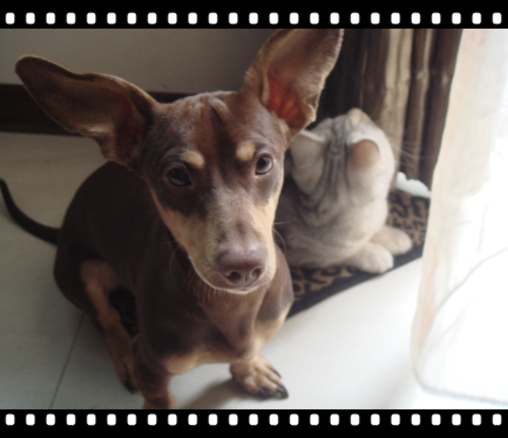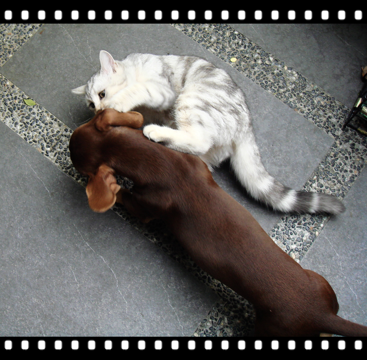 在被我一再目擊之後,我真的無能為力了!那一晚,我又看到我貓貓在抓著我新買的雞冠花再偷吃,以一種小時候我們小孩子偷摘那棵〔相〕了很久的熟拔樂、熟釋迦,那種〔不到手絕不手軟〕的志在必得眼神。我曾仔細地撫摸她的四肢肌肉的大小與緊實度,後腿果真有如金華火腿般的碩美橫生。所以她能長久以後腿支撐站立,兩隻前腳攀抓食物或玩具,姿態從容優雅。貓愛吃花。至少我的貓愛吃__最近前陽台上,幾盆花草被撂倒,泥土被翻攪一地,落葉與乾泥亂糟糟地慘不忍睹。我一直認為是那隻比狗還要笨的狗幹的好事,藉以報復我的新歡_貓。他的失寵讓他獸性大發亂趴土製造混亂....甚至把我尚未看完的報紙拖到沙發背後__全咬成碎片!還有把我珍藏了幾十年的大學系服__棒球外套,趁我不在家時候,從沙發上拖下地當睡衣,還鑽進袖子裡當蛇龍取樂!(你看他那付詭笑的樣子)秋冬前陽台被太陽曬得好暖和的午后,他總趴在地上曬太陽吸取紫外線來增加他皮毛的閃光度,反正身為寵物就是要會有〔自得其樂〕的本事才好。直到某一早我才發覺了真相:這隻沉靜的驕貓恐怕也收服了這隻比狗還笨的狗了__倆倆在前陽台,光天化日之下_沒有穿衣服,玩起裸曬的勾當。貓兒誘起狗兒幫她抓背與按撫,最後情不自禁之下,伸起長舌__玩起舌吻起來!春情漾漾,讓我看得快腦殘了!我們為什麼能這樣忍受這對狗男貓女的對待呢?還不是因為:狗來富,貓來金__因為我家的貓,名喚〔金幣〕_是隻招財貓呀!