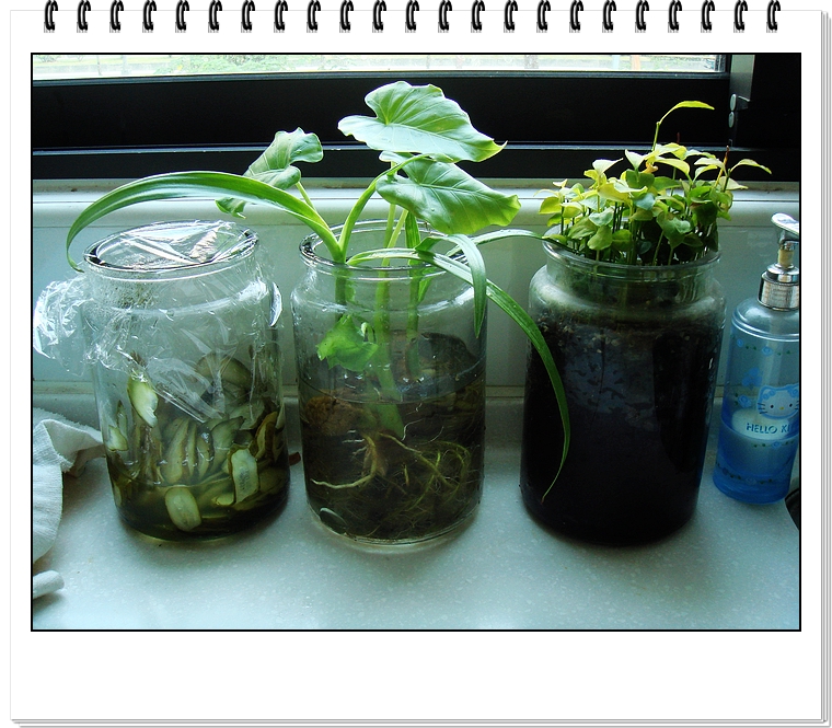 我從爸爸的荒棄的果園裡拔回幾棵矮種的姑婆芋,麥飯石鋪底用清水養在玻璃罐中,我放在可以遠眺高山的廚房窗台上,每日換水就欣賞它們一回,這是從家鄉帶回的清香野味_除了想像童年__我還多了泥土思念思鄉的綠意生氣。我可以想像.....這窗前姑婆芋小小的綠手向我搖曳魔幻,我夢裡的天堂。