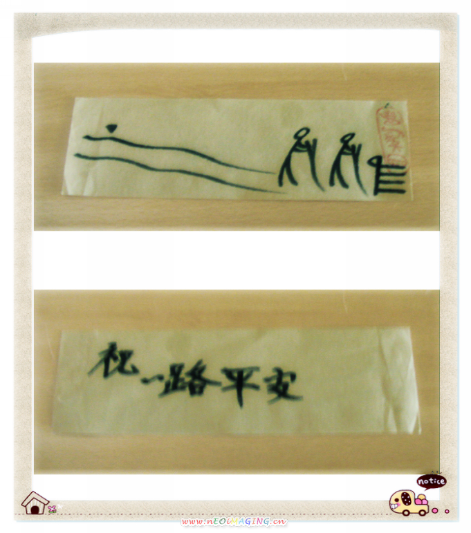 他不認識我,我不認識他這位喇嘛他坐在上玉龍雪山的索道入口處旁的小桌,由於位子的特殊,他必定在當地有特殊的地位是個三十多歲的喇嘛要上山前送了我一張祈福卡〔祝一路平安〕我歡喜地接受了,收入夾藏在隨身的書裡他傲然自若地說:你們台北也有收藏他的書畫呢!(或許也在介紹他的來歷讓我這外來客知道吧)我淡然一笑合十感謝人生何處不相逢我這過客接受他的一番祈福也是種際遇平安是福,平安的祝福送一份夢想讓你逍遙。平安是喜,平安的喜悅送一份美麗讓你歡笑。平安是月,平安的月光送一份溫馨給你浪漫。平安是日,平安的陽光送一份精彩給你溫暖。 〔祝一路平安〕這是種多溫暖又多懸念的心情阿旅行道上,一路平安人生道上,一路平安生命征程,一路平安