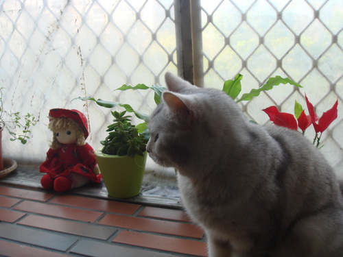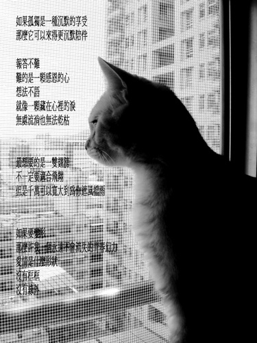 為了牠 ,特意讓每一個窗戶與陽台可以通行無礙。牠在我窗前的陽台上可以恣意的飽覽風景,車聲風聲雨聲只要看牠的動靜便知道了。微風在牠身上輕拂著,柔軟的把每一根毛疏理。都市永不停歇的車流聲,看牠耳朵豎起的角度就知道分貝多少,偶而牠會凝視玩弄牠的戰利品__蟑螂、蜂蝶、蛾虫等。專注的表情有時連我都覺得不可思議。