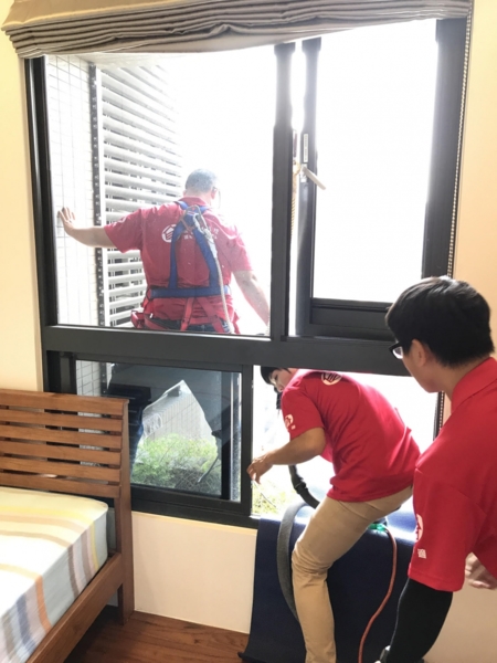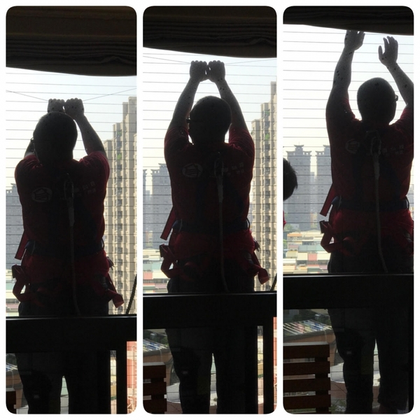 師傅安裝時很嚴肅不聊天, 助手非常謹慎聽從指示協助, 鑽洞時小助手立馬使用吸塵器吸走掉落的水泥粉屑跟灰塵, (沒錯!是伸到窗外吸喔)