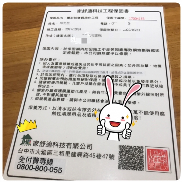 而且不只有保證卡,還給我一份鋼索的材質證明和出廠證明, 讓我真的很放心,材料的來源很清楚,不用擔心去裝到劣質貨。 重點是,家舒適有提供五年保固,真的好棒棒! 兩位助手此時正以迅雷不及掩耳的速度把工具撤離, 然後房間用吸塵器吸過, 鑽洞密縫用抹布擦拭過, 觀眾朋友~ 你說不給幾霸昏行嗎? (ゝ∀・)b 再看一次還是很漂亮 有了它 就是家最美的風景~ 魍美真心推薦:「家舒適隱形鐵窗」 ※服務好 ※價格公道 ※施工品質優 而且不論是業務人員或是施工人員, 每位人員都非常專業, 看得出他們公司的用心培訓。 真的超推推的啦~ 如果你們家剛好也有需要的話, 可以直接連絡「家舒適隱形鐵窗 0800-800-055」喔! (´▽`ʃ♡ƪ) |
