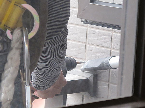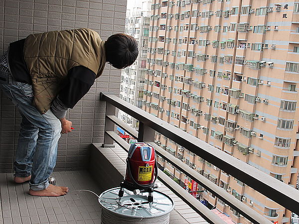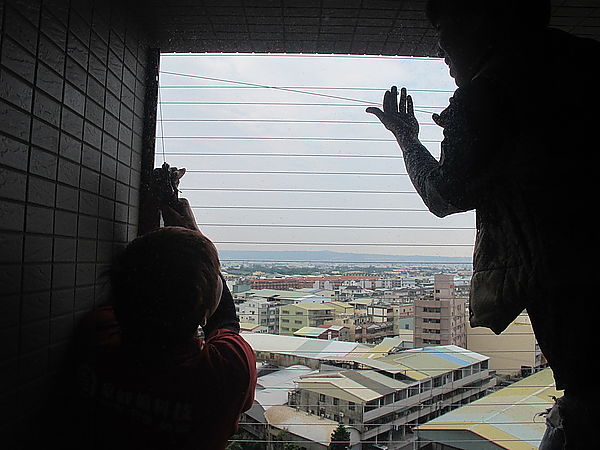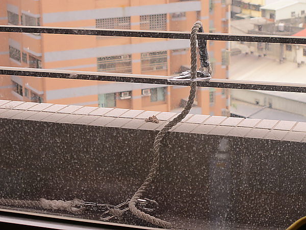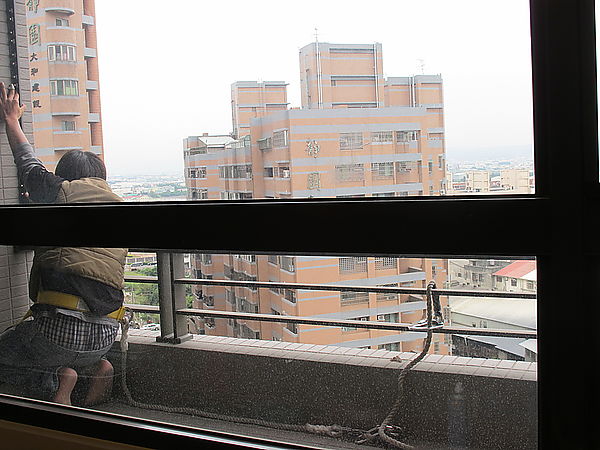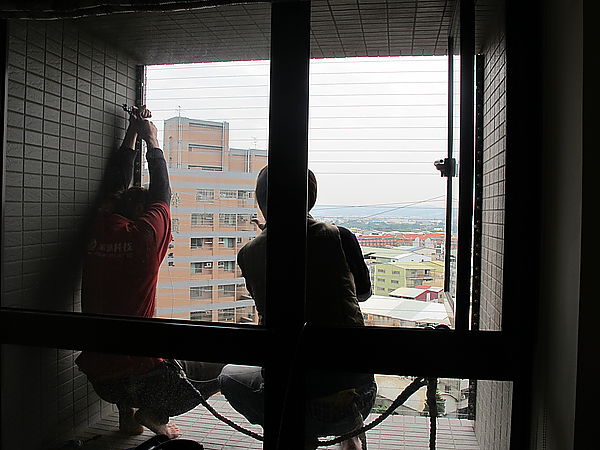 師父開工啦~~ 保護別人,也保護自己哦~~ 纜繩固定在陽台,以防萬一,確保施工的安全度!!!