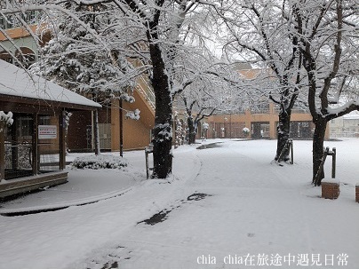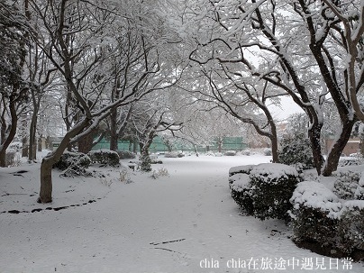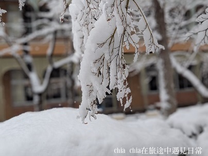 公園旁邊是兒子以前就讀的小學,櫻花樹的枝條上,雪卡得緊緊的。深色的樹枝和白色的雪形成對比,看起來特別好看。平常不太起眼的校舍,在雪的襯托下,成了畫面的一部分,有前有後。