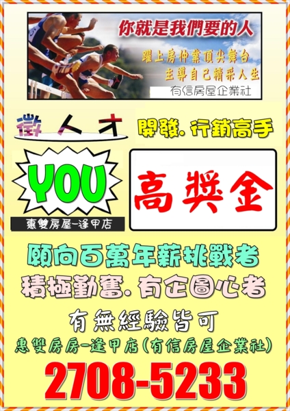 不動產物件開發及銷售,歡迎同業先進有意獨當一面,願向高額報酬挑戰者,歡迎加入惠雙逢甲店~誠摯邀請具服務熱忱的您、開發行銷高手、一同加入不動產仲介、共同創造幸福願景