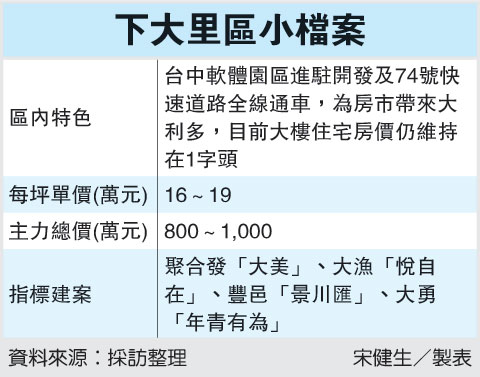 區域介紹:台中市大里區下大里的十九甲及草湖地區,在台中軟體園區進駐開發,以及74號快速道路全線通車後,為房市帶來大利多。這兩項建設,不但引進大批就業人口,也提供便捷快速的交通,房市前景看俏。 值得注意的是,此區也是目前台中大樓住宅房價仍能維持在1字頭的少數地區,首購族可多加注意。 看好理由:大里溪與頭汴溪交會的十九甲,以及大里橋以南至台中軟體園區的草湖地區一帶,過去因交通不便,房市發展幾近停滯,幾年前曾有一波透天推案潮,總價在500萬至700萬元間,但不久房市就趨於平靜。 區域現況:目前此區大樓預售案,包括聚合發「大美」、大漁「悅自在」、豐邑「景川匯」及大勇「年青有為」等,後續還有三、四案要進場,選擇性大增,購屋人可評估建商品牌與地段再作決定。 至於產品規劃,多為27至30坪二房、33至37坪三房、42至45坪四房格局,建商開價約18萬至20萬元,成交落在16萬至19萬元間。大樓中古屋,多為921地震前推出,每坪單價約10萬元上下。 |