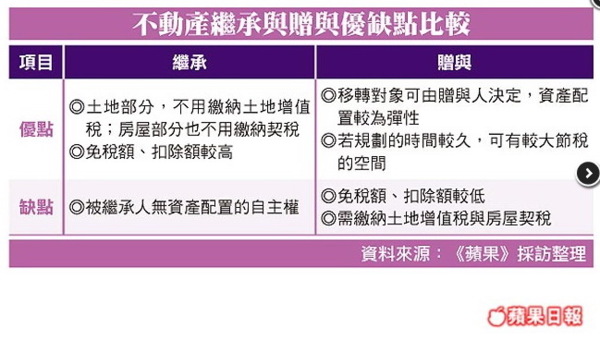 採繼承無法自主配置遺產稅的免稅額高達1200萬元,且有免徵土地增值稅的優點,但中信房屋資深法務專員白宗益說:「以繼承方式將房產留給後代,會有被繼承人無法提前規劃,自主配置資產的問題,故不少高資產族群仍會選擇以分次贈與來合法節稅。」