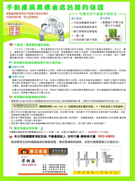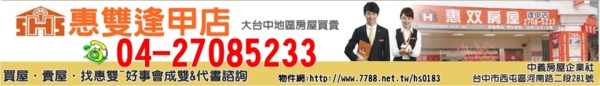 歡迎委託買賣:04-27085233 or 0932-638310 大台中地區~西屯逢甲水湳經貿園區~買屋賣屋~置產投資~請找我們 投資.收租.保值.增值.節稅.房地產相關諮詢.歡迎來電 04-27085233 物件網 「http://www.西屯逢甲買賣.tw 」 惠雙網 「 http://www.7788.net.tw/hs0183 」 中義房屋企業社-專營西屯逢甲水湳經貿新光三越大遠百十二期土地房屋 《誠徵:業務高手 高獎金65%.福利好 ~ 獨立自主.歡迎加入我們!!!》 |