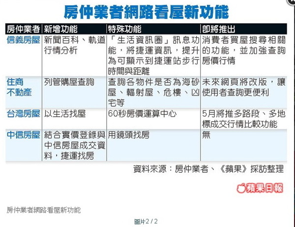 【張菱育╱台北報導】網路找房漸成風潮,各房仲無不加強自家的網頁功能,包括台灣房屋、住商不動產、信義房屋等,近期都新增房市行情分析、查詢物件是否為海砂屋、輻射屋、危樓等新功能,房仲業者說,自從新功能上線後,預約看屋量明顯增加30%。 瀏覽量多出15%台灣房屋首創以「生活」找屋,分析物件周邊的「十大指數」,藉由指數高低了解生活環境。台灣房屋網路科技服務事業群行銷經理林大綱表示,3月網路新功能上線後,網路瀏覽量增加15%、預約看屋量則增30%。