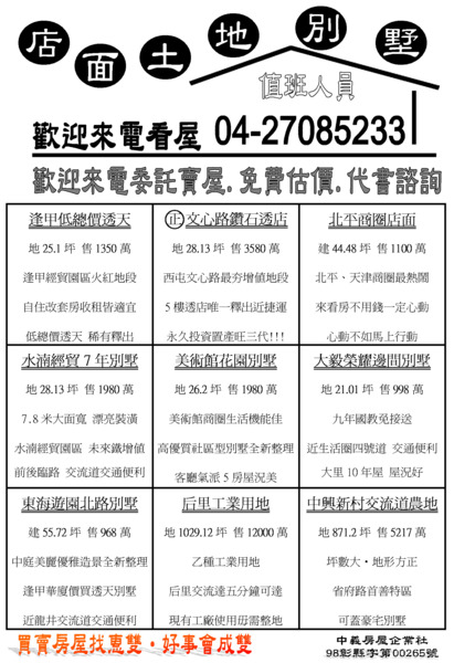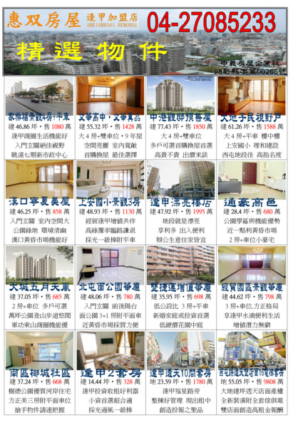 歡迎委託買賣:04-27085233 or 0932-638310 大台中地區~西屯逢甲水湳經貿園區~買屋賣屋~置產投資~請找我們 投資.收租.保值.增值.節稅.房地產相關諮詢.歡迎來電 04-27085233 物件網 「http://www.西屯逢甲買賣.tw 」 惠雙網 「 http://www.7788.net.tw/hs0183 」 中義房屋企業社-專營西屯逢甲水湳經貿新光三越大遠百十二期土地房屋 《誠徵:業務高手 高獎金65%.福利好 ~ 獨立自主.歡迎加入我們!!!》 |