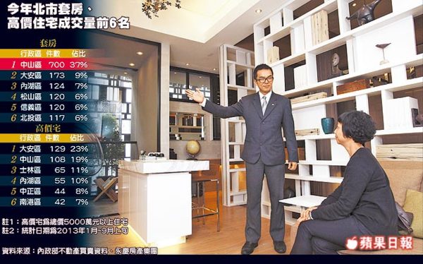 【張菱育╱台北報導/蘋果日報】今年低價產品市場當道,統計1~9月內政部實 價登錄發現,台北市套房成交件數達1886件,其中又以中山區交易量高達700件最多,佔北市整體37%,大幅領先排名第2名的大安區9%。房市業者指 出,中山區低價套房產品多,自住客達7~8成,房市交易熱度也居各行政區之冠。 每坪單價6字頭信義房屋中山南京店店長表示,中山區套房因總價相對低,較好入手,買方不少是新婚族或上班族,自住佔7~8成,投資佔2成左右。 大開發案受矚目中山區除套房交易熱外,統計今年1~9月上旬北市5000萬元以上住宅交易也發現,中山區5000萬元以上住宅交易量達108件,佔北市高價宅交易量的19%,排名第2,僅次於大安區的23%。 大安區豪宅數多黃舒衛指出,歷年中山區推案量在北市位居前茅,今年在自住與置產的買氣下,使中山區成為北市最主要的房市交易熱區,1~10月中山區平均每月536件建物買賣移轉量,居各行政區之冠。大 安區為市中心傳統豪宅區,今年高價豪宅交易件數最多,中信房屋大安新生加盟店店長戴龍祥說,大安區因有台大、師大等文教區,公務人員多,換屋族佔5~6 成,物件每坪單價90~100萬元,坪數40坪以上的換屋型物件,總價至少5000萬元以上,中古大樓社區像是「台大新象」、「羅曼羅蘭」、「莎士比 亞」、「師大禮居」等,總價皆要5000萬元以上。 歡迎委託買賣:04-27085233 惠雙房屋-逢甲加盟店[有信房屋企業社] 大台中地區~西屯逢甲水湳經貿園區~買屋賣屋~置產投資~請找我們 投資.收租.保值.增值.節稅.房地產相關諮詢.歡迎來電 04-27085233 物件網 「http://www.西屯逢甲買賣.tw 」 惠雙網 「 http://www.7788.net.tw/hs0183 」 惠雙房屋-逢甲加盟店 您買屋賣屋的最佳選擇 |