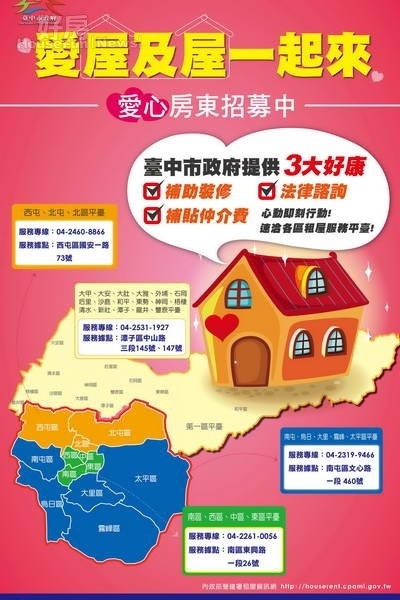 市府都市發展局配合內政部營建署補助獎勵,將台中市二十九區分成4個區域,透過委託勝麗資產管理公司、永勝不動產公司、永勝資產管理公司等3家現有不動產 服務公司,於10月份上線擔任租屋服務平台,以及財團法人伊甸社會福利基金會11月份上線擔任山海線行政區租屋服務平台,協助中低所得家庭或一般民眾租屋 的服務。