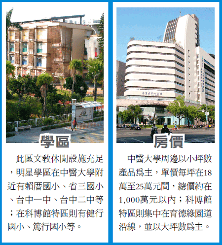 市調顯示,相較於七期、五期、八期及12期重劃區房價不斷飆漲,北區近幾年房價多處於穩定狀態,去年以前,中醫大學商圈房價還在1字頭,今年站上2字頭;科博館商圈原本就屬豪宅區,房價則在3字頭至4字頭間。 信義房屋北區健行店經理邱嘉鈴表示,台中市北區生活商圈,大致以大雅路與健行路十字線幹道為主軸,北側以太原路為界、南到五權路,東為崇德路、西至台灣大道,上述幾條幹道也為此區建構便利的交通路網。 至於主力商圈,則以中醫大學及科博館為雙核心向外延伸,這兩個商圈就像舉重啞鈴的兩個頭,中間以育德綠園道串聯一氣,產品從大樓、別墅、店鋪、整棟投資套房,應有盡有。 中國醫藥大學於1975年創辦附設醫院,台中校區主要分布於學士路與英才路口,以及五權路與學士路口,學校師生超過8,000人,醫護及行政人員則有4,000餘人,為此區房市提供穩定客源。 邱嘉鈴指出,2007年中醫大學五權校區擴建啟用,由於靠近中友百貨與一中夜市商圈,吸納附近的台中技術學院、台中體育學院師生,更帶動整個北區生活商圈重新盤整。 中醫商圈除了在地客之外,最重要的外來客,是中醫大學的學生家長,其次為醫生及護士。因為醫學系學生修讀時間長達七年,許多學生家長乾脆為孩子購屋,省去租屋麻煩,將來畢業了,脫手轉賣也有增值空間。 目前,此區新成屋集中在進化北路的崇德路與梅川東路間路段,平均屋齡都在十年以內,包括「勝美學」、「學士會館」、「浪漫紐約」,十年以上個案則有惠宇「桂冠」、宏總「加州」等。明星學校包括賴厝國小及省三國小。 邱嘉鈴表示,中醫生活商圈現階段最夯的產品,以小坪數的一房一廳、二房到三房格局為主,單價雖已推升,但因坪數小,總價多能控制在1,000萬元以內,市場接受度頗高。 以完工四年的「勝美學」為例,目前成交行情每坪19萬至25萬元,去年平均行情還在17萬至19萬元間。社區共有275戶,一房一廳總價約500萬元,二房在700萬至800萬元間,三房則在900萬至1,000萬元。 另外靠近中醫大學的五權路,「勝美容邑」、「佳泰樂薇」等案,平均每坪單價在17萬至20萬元間,「親家時尚」較高,約20萬至25萬元。 邱嘉鈴表示,此區店鋪總價較高、投報率相對降低,反倒是育德路、美德路沿線,有不少整棟出租的套房產品,以目前月租5,000元起跳的行情估算,平均投報率至少都有5%至6%,當個包租公是不錯的選擇。 |