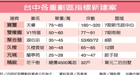 建商直指台中市的地價太高,是市府標售土地帶頭炒高造成。近期台中市土地標售,以上個月廍子段最熱門,上市建商總太、大城、遠雄、名軒都進場有斬獲,大城建設更以每坪最高開出52.68萬、溢價307%最受市場矚目。 台中市副市長黃國榮表示,廍子段是當地公設發展已成熟,建商才願意出高價標售,完全是市場機制,收入全歸公到市庫,用作各項建設;當地還有7.7公頃,目前沒有標售計畫。 業界推斷,這區房價有機會挑戰每坪30萬元,目前該區新進個案元城建設「蘭亭苑」,每坪開價25至28萬最高。 另位建商指出,同是廍子地段,差不多地區的地價本來落差很大,但標售後的地價全開始進行所謂的「補漲」;他指出,倒楣的還是買不起房屋或多花大錢買房的消費者,不少建商則無地可建。 十月中旬以來,北部建商南下台中搶地,興富發、國泰、遠雄、名軒等建商各有所獲,其中遠雄建設腳步最積極,繼單元二高價搶標後,最近陸續在清水、廍子段、 8期重劃區續有斬獲;興富發則購入7期西側惠安段471坪土地;國泰購入科博館旁英才路625坪土地,刺激台中各重劃區啟動補漲行情。 嶺東南屯區保安段667坪台糖土地由台中昌佑建設以每坪43.18萬取得,未來房價將上看25萬起跳;遠雄建設近日再以每坪163萬搶下8期文心南路上 2352坪(原夜市用地),未來房價每坪將從40萬元起跳,勢必帶動附近南區、8期、楓樹里房價上漲;即將進場的「聚合發湖心泊」每坪開價35至45萬, 楓樹里「旅建築」每坪25至30萬。 國泰建設近期以每坪近130萬購入科博館625坪土地,推案上看每坪40萬起跳,可能帶動草悟道與5期房價的競爭;5期重劃區的「寶璽高第」每坪成交價今年站上40萬元;國美館的「富邦天空樹」、「由鉅大恆」每坪50萬起跳,房價創新高。 興富發建設以每坪121萬元購入西屯區保安段471坪土地,帶動附近單元一、二及7期、12期房價上漲;目前寶璽7期新案房價開出每坪75至85萬,12期新成屋「久樘香波」開出每坪36到48萬,順天新案預估也在40萬上下,紛改寫在地區域房價新高。 沉寂一段時間的7期新市政中心,由於受到各重劃區大漲及北部知名建商大陸工程、富邦建設南下插旗推案的競爭下,11月下旬首先由位於市政北一、惠中路口的「聯聚泰和大廈」登場,坪數約在115、230坪,預估每坪單價約60萬起跳,最受市場矚目。 寶璽建設位於府會園道上的「寶璽天睿」,規畫160坪雙併,每坪單價開出75至85萬元新高而受到市場矚目;位在市政北五路上的大陸工程新案,個案規劃約140、160坪,業界預估每坪80萬起跳,有機會創下台中豪宅房價新高。