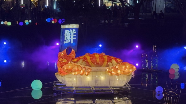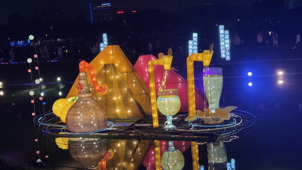 河道水岸布置相當多組的大型燈劇組,可以看到飛躍的海豚,噴水的鯨魚、從海面升起的太陽、在花間飛舞的五色鳥、酒杯,搭配文學家的詩詞,頗具詩情畫意。