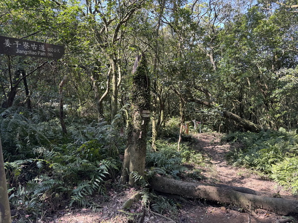 前方有三根巨木,標示姜子寮山步道字樣。