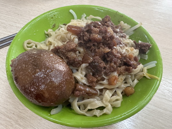 乾意麵+滷蛋,阿三鹽水意麵是自家生產製作,有一定的口感,肉燥香氣不錯,還加入不少豆芽菜,增添脆甜口感,因為加點了滷蛋,絞碎後拌入麵條之中,增加了古早味的蛋香,感覺口味更多層次,更好吃了。