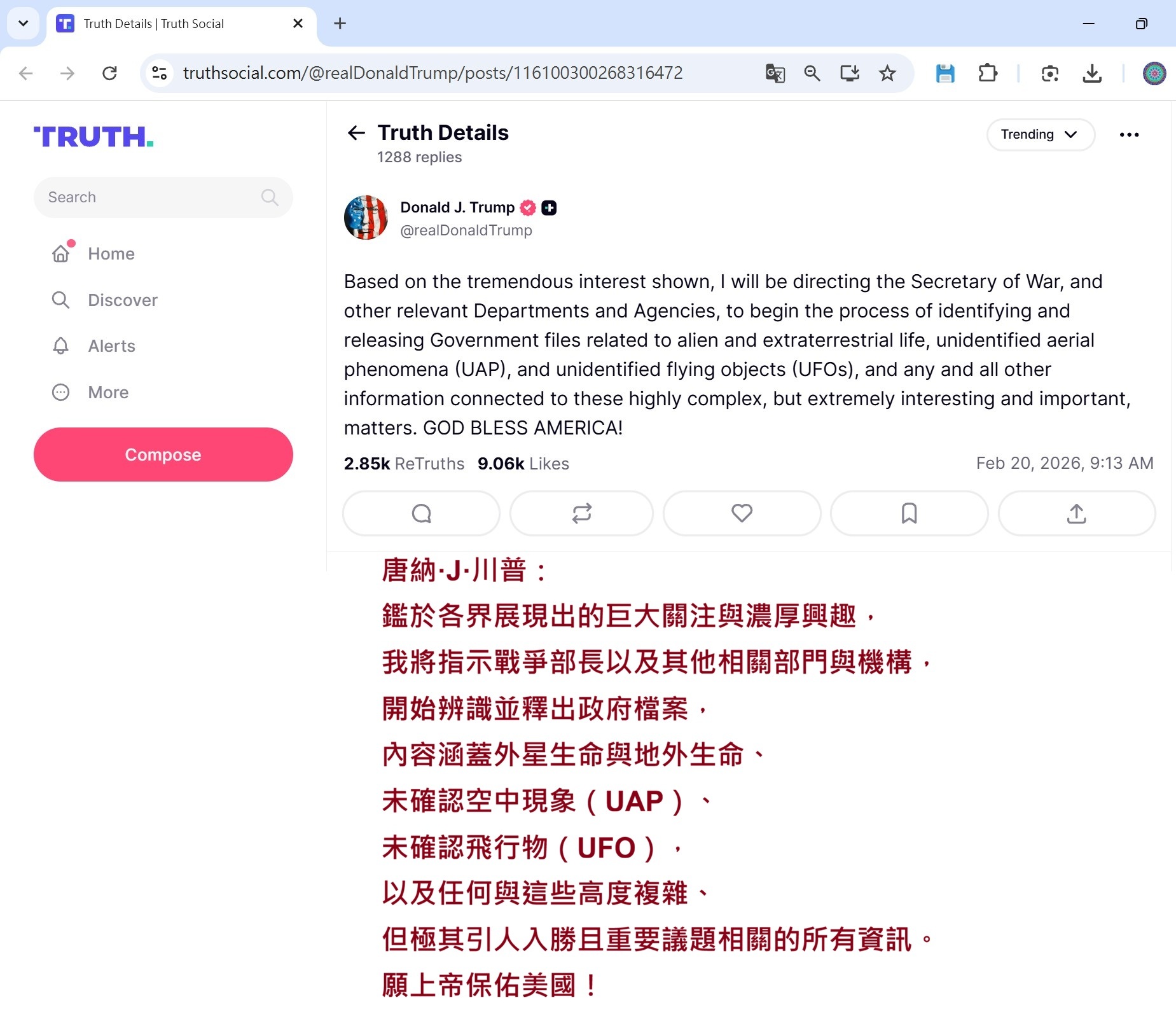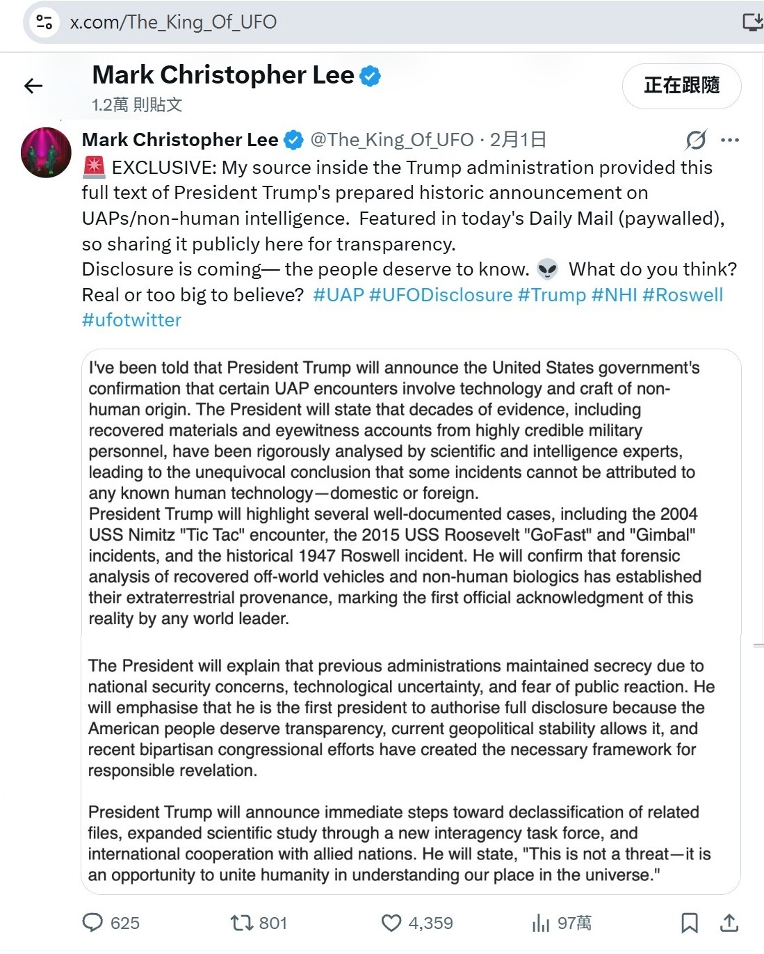 釋放外星人訊息遭到內部抵制 川普要公開外星人 五 https://www.youtube.com/watch?v=Ae8JbdS3j7g -- ------------------ Mark Christopher Lee @The_King_Of_UFO 緊急更新:內部人士反對川普公佈UFO文件 URGENT UPDATE: Insider pushback on Trumps UFO files release https://x.com/The_King_Of_UFO/status/2025220655638061396?s=20 -- https://x.com/The_King_Of_UFO/status/2025220655638061396 -- My Washington insider source has just updated me following President Trumps directive to release all alien/extraterrestrial and UFO files. There is massive pushback inside the administration and parts of the Pentagon. Some believe the UFO phenomenon is linked to demons and should be left alone - theyre terrified of telling the public. How would people react if they were told this? Especially Evangelicals waiting for the second coming, end times, and rapture - this could be seen as biblical prophecy unfolding. My source says there is evidence some UAPs are inter-dimensional rather than extraterrestrial. This may be why Trump called these matters "complex." The July 8, 2026 speech (79th Roswell anniversary) is still planned to confirm visitation and recovered evidence - but it will likely stick to more conventional UFO sightings and Roswell. The truly weird/inter-dimensional aspect wont be released to the public just yet. This ties directly into my 2024 film God Versus Aliens (on Tubi), where I explored the idea that UFOs could be demonic/inter-dimensional. That film brought me to the attention of Evangelical Christians in the US and sources inside Washington. It also covered the alleged Collins Elite - the secret group said to control the UFO agenda and insist the demonic origins must be hidden from the public. What my source is reporting now validates everything I investigated. The resistance is real, but the truth is unstoppable. My source is still set to come forward at the formal press conference on May 1, 2026 in Washington DC. The momentum is building - disclosure is happening faster than anyone predicted. Stay tuned. 我的華盛頓內部消息人士剛剛向我透露了川普總統下令公開所有外星人/地外生命和不明飛行物(UFO)檔案的最新消息。 政府內部和五角大廈部分部門對此有強烈的反對意見。有些人認為UFO現象與惡魔有關,應該置之不理──他們害怕將真相公諸於世。如果人們得知真相,會如何反應?尤其是那些等待基督再臨、末日和被提的福音派信徒——這可能被視為聖經預言的應驗。 我的消息人士稱,有證據顯示一些不明空中現象(UAP)並非來自外星,而是來自跨維度空間。這或許可以解釋為什麼川普稱這些問題「複雜」。 2026年7月8日(羅斯威爾事件79週年紀念日)的演講仍計劃舉行,旨在確認外星人造訪和已回收的證據——但演講內容可能更側重於傳統的UFO目擊事件和羅斯威爾事件本身。真正詭異/跨維度的面向暫時不會向公眾公佈。 這與我2024年上映的影片《上帝大戰外星人》(可在Tubi觀看)直接相關,我在片中探討了UFO可能是惡魔或跨維度生物的觀點。這部影片讓我引起了美國福音派基督徒和華盛頓內部人士的注意。影片也揭露了所謂的「柯林斯精英」——一個據稱控制UFO議程並堅持要向公眾隱瞞其惡魔起源的秘密組織。我的消息來源現在透露的資訊證實了我之前調查的一切。 阻力確實存在,但真相勢不可擋。我的消息來源仍將於2026年5月1日在華盛頓特區舉行的正式記者會上公開露面。 勢頭正在增強——真相披露的速度比任何人預想的都要快。敬請期待。 -- ---------------------- EXCLUSIVE: My source inside the Trump administration provided this full text of President Trumps prepared historic announcement on UAPs/non-human intelligence. Featured in todays Daily Mail (paywalled), so sharing it publicly here for transparency. Disclosure is coming— the people deserve to know. 👽 What do you think? Real or too big to believe? 獨家消息:我從川普政府內部人士處獲得了川普總統關於不明空中現象/非人類智慧的歷史性聲明全文。該聲明已刊登在今天的《每日郵報》(需付費閱讀)上,為了確保透明度,我在此公開分享。 真相即將大白──人民有權知道。 👽你怎麼看?是真的還是難以置信? https://x.com/The_King_Of_UFO/status/2017910175198220345?s=20 -- https://x.com/The_King_Of_UFO/status/2017910175198220345 ------------------------------- 超自然UFO聯繫 The Paranormal UFO Connection https://player.truthsocial.tv/search/ufo/vod/1545 ---------------- --------------------------------------------