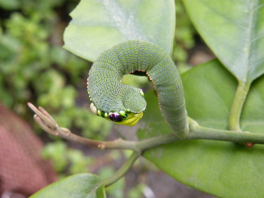 幼齡的大鳳蝶幼蟲長得像顏色偏綠的鳥糞,終齡幼蟲 則為綠色帶白色蕾絲花紋。長相像鳥糞的幼蟲最後將會變成鳳凰─鳳蝶。 ![]() 大鳳蝶終齡幼蟲