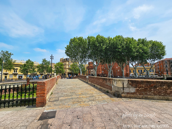 #5.這條紅磚橋橫跨在巴斯運河上,右前方那座隱身在林蔭後的紅磚建築就是卡斯蒂耶(Le Castillet),這一帶都屬於佩皮尼昂的舊城區。