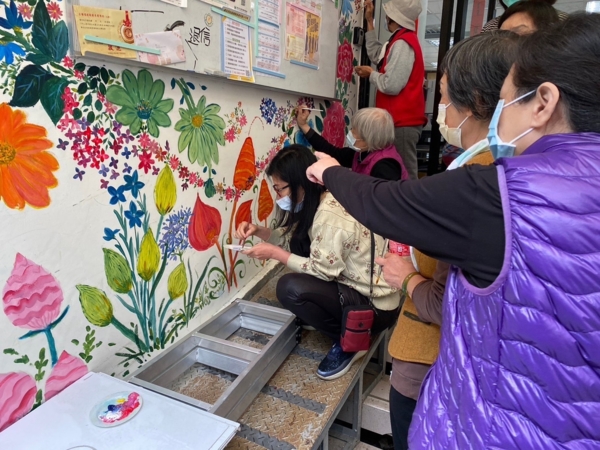 每個人都是潛在的小畫家 (文/據點社工 賴世芸) 古亭據點的長者感覺是有受過很好教育的一群,真是充滿氣質又可愛,每每上課都很虛心受教,不僅專心投入,也樂於分享,感受到他們的樸實與單純,也真的有很多地方可以跟他們學習。 今年開辦的「禪繞畫課程」,一樣邀請到之前的陳慧燕老師,這次老師上課的模式和以往的不太一樣,就是有實作「彩繪外牆」。因為主任有特別跟老師討論,因為門口外牆的公布欄實在太不好看,缺乏美感,就只是一面白牆,希望可以請老師帶著長者一起美化我們的外牆。前面幾堂課,老師先帶著長者們畫禪繞畫,之後教導長者一些不同的作畫方式,在後面幾堂就是實作彩繪。 彩繪外牆時,一開始大家都不敢下筆,覺得自己畫的不好看,害怕外牆會毀在自己手上。所以有幾位長者就卻步,甚至後續就不敢來上課,一直擔心自己畫不好,為他們沒有繼續而感到可惜。 期間我們也一直鼓勵長者:「你真的畫得很好!」但他們都很謙虛說:「沒有,畫的不好看,其他人的比較好看。」我繼續鼓勵:「哪有,你們都很厲害,畫得很好看耶!」但有的長者還是很沒自信,自然也就不勉強他了。不過有的長者在我們的鼓勵下,留下來跟著大家一起完成門口的外牆,一起參與了這份榮耀。 繪畫老師先一步一步示範,一撇一畫地畫給大家看,大家才跟著老師一起在牆上作畫。有玫瑰花、朱槿、鼠尾草、小菊花、太陽花、風信子,也有藤蔓、綠葉、蘑菇…,簡直五彩繽紛,一個美麗的花園漸漸展現在大家的眼前,令人心情大好。 每個人都很認真,也畫得很開心,看到公布欄下方還有空白的地方,還會搶著畫,但因為要蹲著,長者沒辦法蹲太久,嘴上又會一直喊說:「膝蓋不好,腳會痛!」但手上的畫筆卻不曾停過,畫累了就站起來換人。 畫到最後,有的長者後來還直接坐在地上了,真的是非常認真地想完成這面外牆。甚至直接請老師來協助,說:「老師,我們老人家啊!棟未條啦!」老師也無奈地笑了。 從開始到最後完成的外牆,我們看到長者們有很大的進步,這是有目共睹的,他們也說:「向老師學習了好多花朵的畫法,才能把外牆畫的這麼豐富。」在最後一堂課,我們還特地安排拍攝採訪,希望留下美好的紀錄,也讓這一整片彩繪外牆有一個圓滿的成果。 一開始大家都很害羞,說:「別拍我,不要採訪我!」抓了一位願意分享的楊大姊來採訪,她開心地侃侃而談,驕傲地說:「我兒子把我的畫po到FB給大家看,結果有好幾千人按讚,真的好開心啊!」 接著其他長者也一一打開心情,紛紛上前分享自己的作品,同時也誇讚老師教得很棒,讓他們從完全不會,到可以一筆一畫慢慢地完成作品。還特別說:「很喜歡這種靜態的課,從開始的一竅不通,到現在回去還能教孫子畫,進步很多,也很有成就感。」 原來,當藝術的細胞被啟蒙之後,就學會了用美的眼光去欣賞這個世界,彷彿看到世界充滿了更多幸福與希望。而這一片美麗的外牆,從此也成了上課之前的必經之地,看見色彩繽紛的美麗花園,讓人無比喜悅。