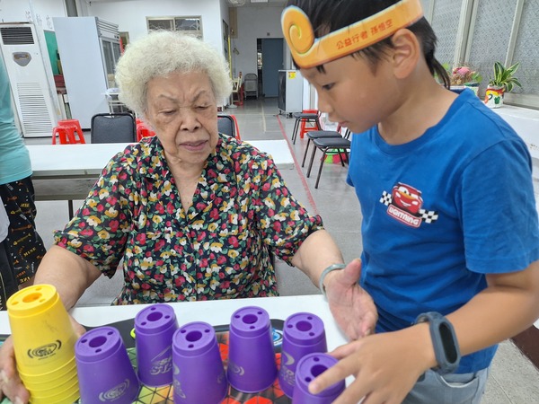 (文/據點社工 彭如妙) 基隆百福課後班為了今年的公益行活動,花了很多心思與努力準備,沒想到舉辦前遇到颱風,雖然一直祈禱不要放颱風假,很擔心活動延期或取消,但最後颱風還是來了,只好延期舉辦。 其實孩子們平時都有在練習疊杯,但每次練習中,總會遇到瓶頸,因為他們總想要突破自己的極限。這次為了表演以及教導長輩疊杯,孩子們加緊練習,因而在技巧上也越來越熟練和進步。 颱風過後,我們與日照中心討論是否有恰當的時間辦活動,沒想到困難重重,時間老是兜不攏,幾乎到了要取消的地步,但我們堅持不放棄,最後終於把活動敲定在八月五日舉行。 活動當天,小朋友們興致勃勃,很努力地完成演出,在教導長者疊杯的過程中,也有許多令人印象深刻的一幕。有的長輩學得很快,還可以做兩色疊杯,真的很厲害。另外,有一些長輩雖然動作較慢,但還是很認真地完成動作,令人非常感動! 由於長輩們只會說台語,我們一位原住民小孩聽不懂台語,緊張地說:「阿公阿嬤怎麼都說台語,怎麼辦,我都聽不懂!」原來兩代溝通中,語言不同也是一種障礙,最後經過協助才完成教學。沒想到,還可以讓小孩接觸到台語,真是很特別的經歷。 看見長輩從不太會疊杯,到慢慢學會,最後可以獨力完成,孩子們臉上展現出笑容與成就感,這是公益行最大的意義。孩子分享:「教長輩的過程很開心,看見長輩上台比賽贏了,還把禮物送給我,真的很有成就感!」 教導疊杯之後,孩子說:「我覺得要慢慢教,阿公阿嬤的技術才會越來越好。」這種跨世代的互動與學習,本就充滿意義,小孩也了解到「公益行」是一個付出與關懷的活動,除了大家互相合作才能完成,而且教學相長,自己也可以獲得更多自信及認同感。 疊杯結束後,大家一起玩滾球遊戲,孩子也是練習很多次才抓到訣竅,玩得很開心。這是我第一次帶著據點小孩做公益行演出,雖然途中遇到了颱風延期,但對我來說,這是一種學習的過程,我也克服自己對上台的恐懼,希望下一次可以進步更多。