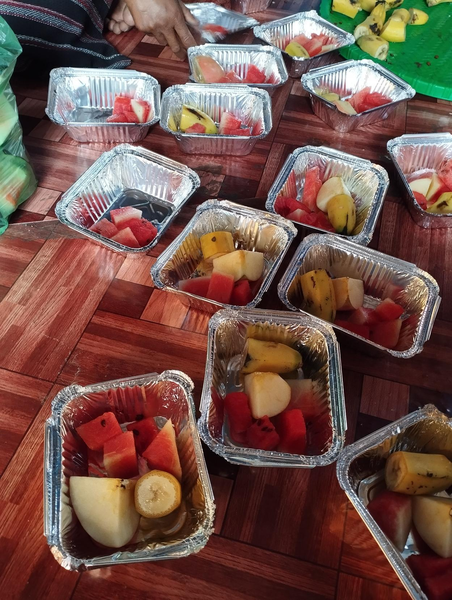 廚房設備簡單,卻有著最真實的鄰里溫度,我們雇用兩位當地居民做為廚房媽媽,雖非專業廚師,卻能煮出孩子們可以吃飽又吃得開心的食物。 據點在4月1日正式啟用,原本預估每天會有50名孩童參與,結果卻來了70多位。 午後點心充滿在地風味,菜色多元變換,有扁豆米飯配水煮蛋、馬鈴薯咖哩、大餅配奶茶、酸奶、季節水果等,兼顧營養與美味。 據點門口掛上了「Children Snack Program」(兒童點心專案)的顯眼布條,充滿童趣與尼泊爾特色,由環宇台灣總會設計,在尼泊爾輸出列印。孩子們好奇地用手指著字念道:「Children!」「Snack!」一邊練習英文一邊開心走進屋內。 這裡,不只是一間供餐的地方,也是他們每日最期待的一段時光。 孩子與社區 正在慢慢改變