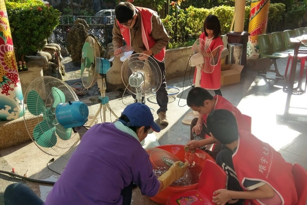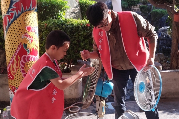星期日早上帶著孩子們到醒修宮一同參與清掃,一到現場孩子們也看到許多人在掃著街道、沖洗宮廟、清洗燈具等等,宮廟幹事一看到孩子們非常開心,先邀請孩子們吃麵飽餐一頓,我們被分配到的是清洗電風扇,有工業用電扇、吊掛式電扇、傳統式電扇等等,有些孩子可能是第一次洗電扇,在如何分解部份不清楚,趁這個機會也是個日常生活的教育,老師講解風扇的外殼如何拆開、怎麼把風扇解開、旋轉的方向為何要刻意設計逆時針,由老師拆開來給孩子們洗,有兩位中低年級的兄妹非常認真的清洗著葉片、外殼、主座,而六年級的小光對組裝有興趣,就讓他嘗試把他自己洗好的葉片、外殼裝回去,然而裝葉片有個小陷阱如果角度沒有對就無法裝進,提示小光這點後摸索一下子,就成功組裝完成,小光很興奮的說:「老師,你看我裝好了!」