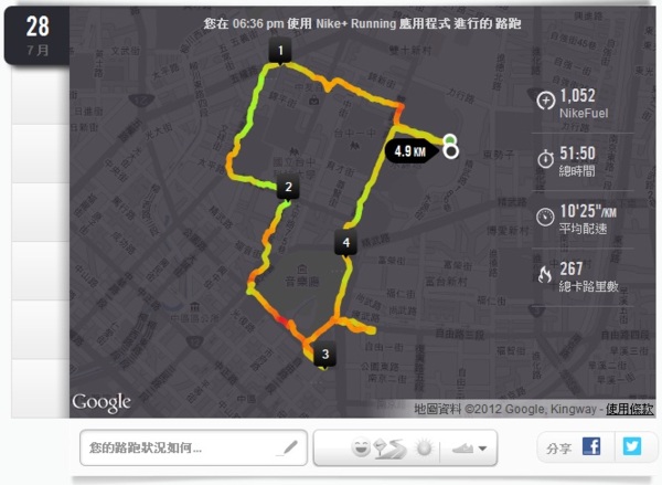 等其他隊伍也回來後,這才揭曉今天大家跑的圖案原來會組成「台中10K」 正是為2012年年底NIKE的十公里路跑賽作預告 比照起綠隊的路徑,我們跑的應該是「台」字的ㄙ字頭進行修圖 不過心想著這回五公里已經要我命了,年底距離再多一倍的話可能就謝謝再連絡囉! 除非...參加十公里路跑NIKE大手筆送慢跑鞋