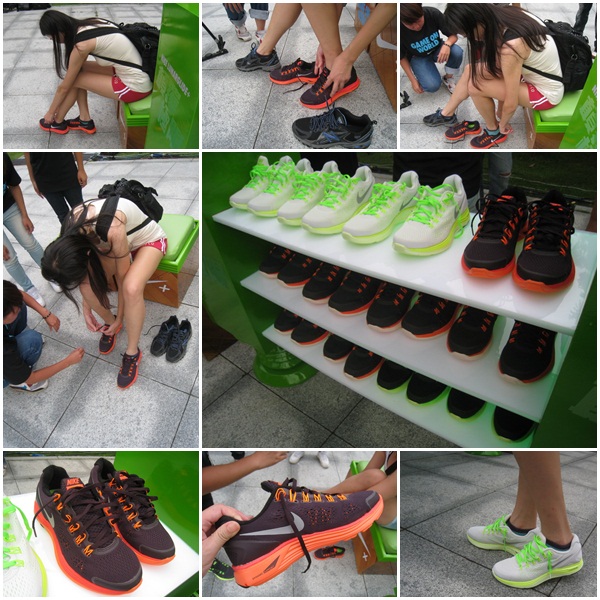 最後「落腳」在跑鞋展示區,一聽到活動可以換穿NIKE的新鞋跑,讓我整個精神都來了 剛好現場也沒啥參加者報到,見我試穿就好幾台相機圍過來讓黃金豬腳也莫名當腿模 第一眼看中的是畫面中紫橘色的鞋,暖色系適合我的熱情小紅褲 雖然我鞋號是8號,但穿上現場最大的8號女鞋好像「太合腳」,不會太緊但大半號會更好 後來再試完白鞋和男款灰底橘邊鞋後,從一而終的麥兜恩還是決定穿回太合腳的那雙 可能因為太喜歡的心理,走走扭扭之後就不會覺得太緊或有任何不舒服的感覺... 喜新厭舊的惡劣行徑應該讓我本來想陪跑的「新平衡」越野跑鞋,內心很不平衡吧!