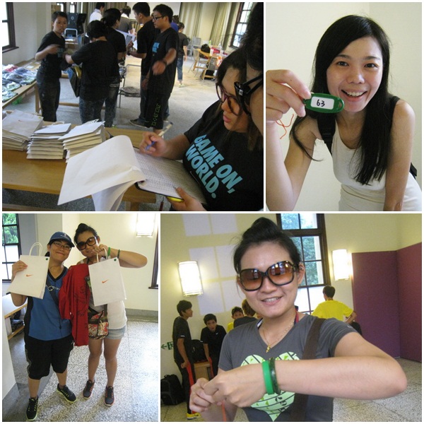 開獎正解是:63號! 門口報到後接著再到室內領服裝,原以為同隊會有同款制服,想不到跟福袋一樣隨機 裏頭除了排汗衫外,還有識別的NIKE紀念綠色手環 我很難形容初次從袋子裡拆出T恤時那種輕柔的觸感,真是輕薄地幾乎忘了它的存在 而且又抽到黑色「破紀錄」圖案上衣,搭褲子剛好「紅水黑大方」,真是命定的組合啊! 難怪Ray說,光為了那件紀念衫來參加活動就值得了