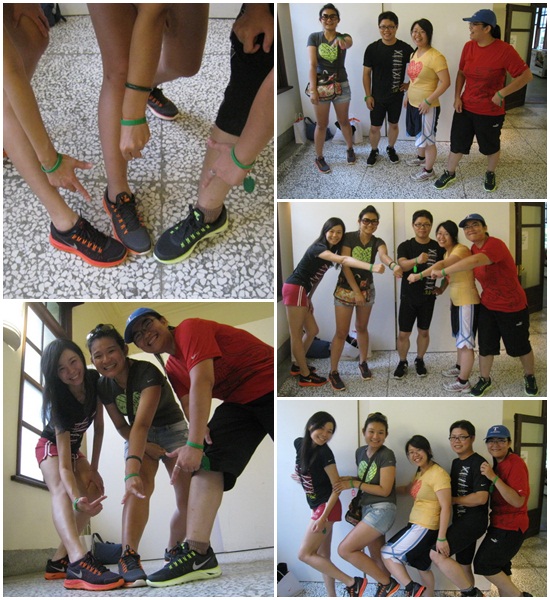 勾勾牌上著v.s下鞋整裝完畢!不過五個人喬半天還是喬不出什麼創意隊形... 發文時認真看照片才猛然發現我跟同事小寶老公穿情侶裝 雖然size有別但衣服應該要換一下才是(絕絕對對不是換人!!!)