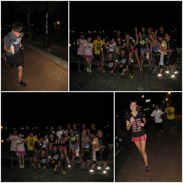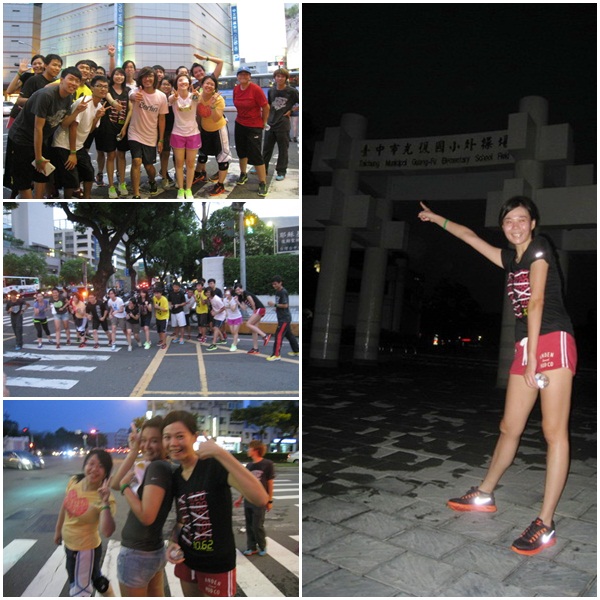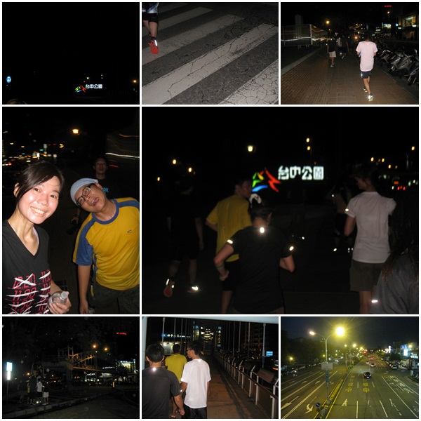 在台中公園勿忘在著名地標前「湖心亭」合影,可惜他傻瓜我笨蛋的相機派不上用場 讓湖心亭隱身在黑暗中只能靠想像意會,等我收集到其他隊友的美照再來補充 不過NIKE的小勾勾在閃光燈下倒是很明顯,穿著它夜跑起來似乎也多了點安全感