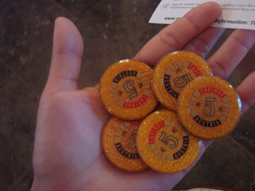 . 2011/06/15(三) . 今天我們一早就要拉車到薩爾茲堡 . 途中經過「月湖」 . 超級美的一個地方 . 拍得照片像明信片一樣 . 聽說電影真善美很多在這個地方取景 . 聽說有個教堂是拍攝主角們結婚的地點 . 可惜我們只是路過沒有進去裡面 . 中午我們在一間台灣人開的餐廳吃飯 . 一下車就聽到熟悉的台語 . 真是讓人倍感親切阿 . 還有卡拉OK耶 . 太帥了~沒想到來到歐洲還能聽到周杰倫的歌XDD . 超嗨的說~~~ . 話說歐洲的天氣真的是很乾燥 . 跟台灣濕熱很不一樣 . 不多塗點乳液都要脫皮了~(其實我已經脫皮了) . 而且太陽感覺都不用休息的 . 晚上9點你還可以看到天亮的景色 . 完全沒有天黑的感覺耶~超特別的 . 難怪拍照回來大家都說你們都很早休息吼 . 天還沒黑就在旅館休息了XD . 我們下午的行程是去 . Designer Outlet Salzburg . 採購的行程 . 因為沒有打算要買什麼包包名牌 . 所以只好隨便逛逛 . 陪著人家逛衣服逛鞋子 . 感覺在國外買不到我的鞋耶~都太大了 . 衣服也很難買 . 可是看到同學大包小包的 . 消費力驚人阿 . 我們的領隊小姐一口氣買了四、五雙鞋耶(驚人) . 總之大家都大豐收阿~ . 其實我們今天最重要的景點 . 是去賭場~~ . 先回飯店換上禮服~ . 大家超正式的啦 . 不過我們得先去吃晚餐 . 因為是去中午吃的那一間 . 所以當我們換完衣服再重回中式餐廳 . 把餐廳老闆下了一大跳 . 感覺一群人好像要去吃喜酒喔XD . 自己看的都想笑 . 來到了賭場 . 可以選擇不玩只看 . 也可以換籌碼下去試試看 . 23歐元可以換25歐的籌碼 . 27歐元可以換30歐的籌碼 . 因為本來就打算試玩一下 . 所以我換了25歐的籌碼 . 不管要不要玩~都要出示護照 . 表示你已經成年了 . 進去後跟我想像的有些落差 . 穿牛仔褲的、抽菸的~ . 我本來以為會更高級一點(可能是賭場的問題) . 因為人很多 . 所以我決定先去玩拉霸 . 其實看不太懂 . 還得先換卡儲值 . 還好我們有老師示範 . 其實就是看著圖片跑來跑去的感覺 . 在這邊玩了一會 . 每種機器都拿來玩一下 . 一直想著要怎麼別輸了(看來我不太適合賭博) . 還好我的籌碼一直維持在小贏的局面XD . 然後先去玩輪盤 . 只敢押紅和黑兩種(至少機率一半一半) . 數字我覺得自己沒那麼好運氣XD . 玩了兩回 . 一贏一輸 . 算是打平了吧 . 接著去玩21點 . 第一次就拿到了BLACK JACK (一張A+J、Q、K) . 得到了1.5倍的籌碼(這就是新手的運氣嗎XD) . 所以我馬上就下台了 . 有贏就好~作人別太貪心 . 其實最終目的就是要把籌碼換回來 . 盡量拿回本錢是我們主要的目的 . 因為一開始在櫃台換的籌碼是不能換回現金的 . 一定得去玩將籌碼換成賭桌上的籌碼才能換回現金 . 沒想到我最後竟然換回了本金又小贏了12.38歐元耶 . 問了問我們班能打平和贏錢的人還真少 . 不過聽說老師贏了不少 . 結果被大家坳請客請了五瓶紅酒 . 他應該賠錢了吧XD . 這次的體驗是個經驗 . 也更確定自己以後千萬別去賭錢 . 因為我輸不起阿XDD . 不過人生中就是要有一回 . 這樣不同的經驗阿~~~ . . . 月湖 http://tw.travel.yahoo.com/scene/article/46068 Designer Outlet Salzburg 21點規則 http://going.110mb.com/blackjack.html 輪盤規則 http://zh.wikipedia.org/wiki/%E8%BC%AA%E7%9B%A4