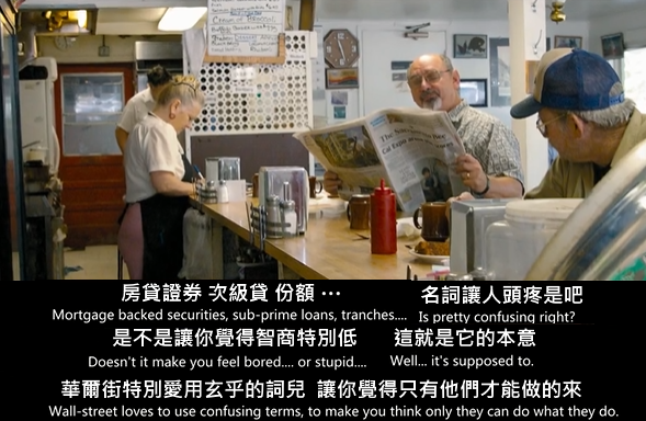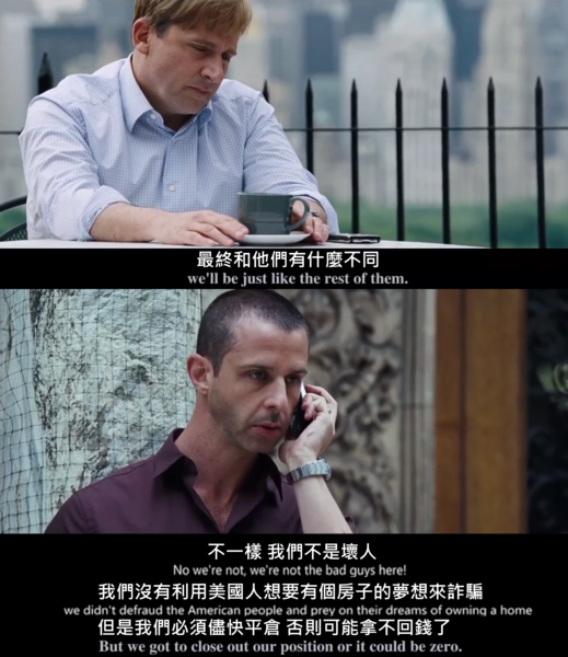 兩小伙以創業增值的三千萬買了CDS靠布萊德彼特的幫忙賣出八千萬,正高興時被對方訓了一頓~~ 不過要說搞壞經濟的罪魁禍首可不是這4 組人,他們的收益總和才20億美元且真正大空頭是約翰保爾森,賺的可是上百億~~這4 組人不過是小咖~~真正的罪人是葛林斯潘與美國經濟部長亨利保爾森以及??幫忙做假的學者 |