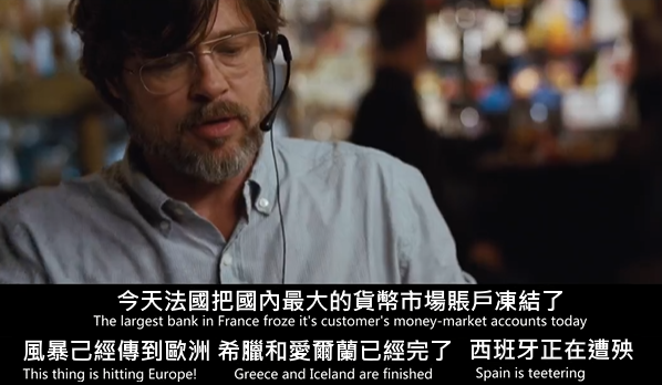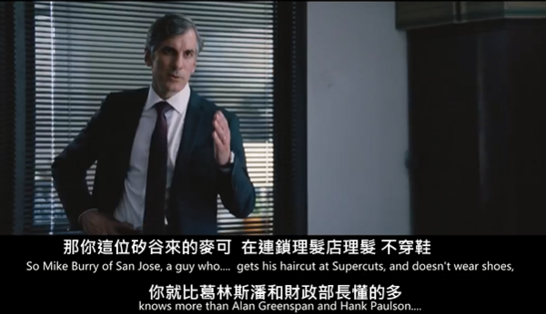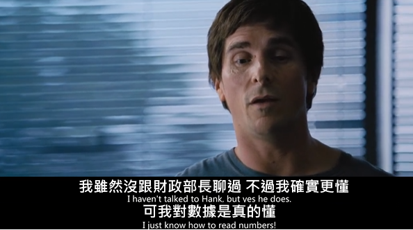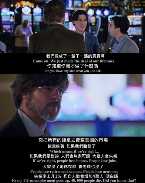 最近上網連看幾部關於金融危機的電影+記錄片~~雖不懂那些圖表&數據但~~~2008年好多人賠錢~~~此片找了不少大卡司如萊恩高斯林、克利斯汀貝爾、布萊德彼特&史提夫卡爾扮4組做空的人,而片中第一位出現的主角Jared Vennett,其實是化名而布萊德彼特是改了姓且片中只是幫忙兩位初出茅廬的小伙的退休資深銀行員