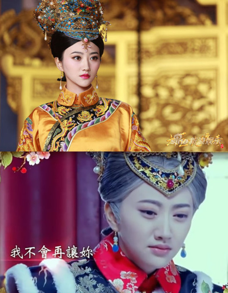 景甜版大玉兒,除了刷白的頭髮與加深的眼袋實在很難說服她那張幼齒白嫩的臉是小康熙口中年老的皇奶奶???? 有次按遙控器按到一看被叫皇奶奶的她,只覺得:當觀眾眼睛瞎了嗎??? 還是有保養品牌贊助,七老八十了臉還幼嫩像十七、八??? 潘迎紫的大玉兒還會口含棉花讓臉頰有下垂感,十足的老人臉而寧靜也滄桑感十足,袁姍姍只比她好一點是因為臉比較方~~~