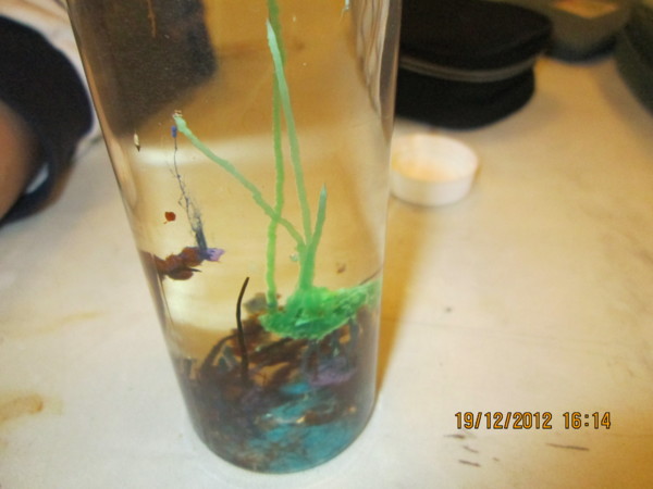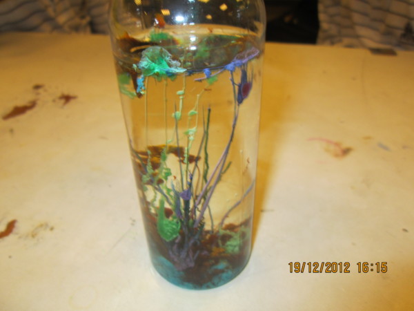 不是水或海水,是水玻璃(矽酸鈉)。調整矽酸鈉的比重,然後將金屬化合物的晶體投入其中,晶體化合物因為滲透壓的關係,在杯底逐漸成長。