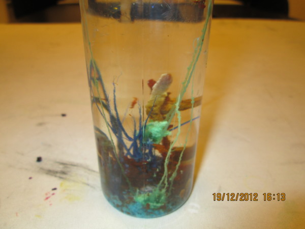 圖片中翠綠的是氯化鎳,褐色的是氯化鐵,深藍色的是氯化亞鈷(原本是紫紅色的晶體),淺藍色的硫酸銅晶體沒有擴散。
