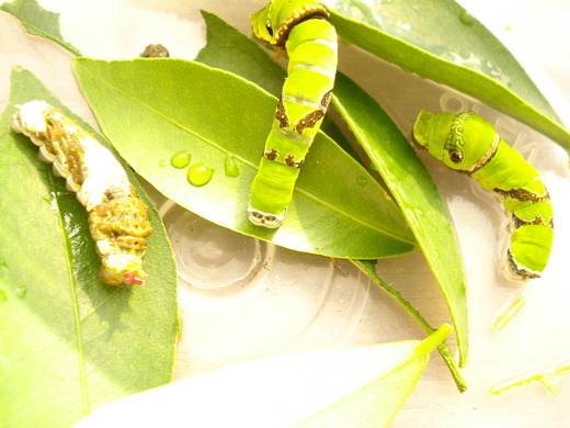 6月29日,早上發現又有一隻大綠毛蟲要開始化蛹,心情超好,但是覺得另外4隻幼蟲卻怪怪的,食量超小。傍晚換葉子時,發現大綠毛蟲不見啦,趕緊找尋四周,可惜還是不見蹤影,只能暫時宣告失蹤…。 6月30日,傍晚換葉子時,打開蓋在盒子上頭的厚紙板,發現牠不一樣耶,和原來養的無尾鳳蝶終齡毛蟲竟然不一樣,大大的假眼,超可愛的,趕緊上網查資料,原來牠是黑鳳蝶的幼蟲,真是驚喜!第一次養毛蟲竟然讓我一次養到二個品種,超開心的!不過開心之餘,發現毛蟲又少了一隻,哎,怎麼又失蹤了呢?!開始懷疑有不良份子偷襲我的寶貝,只好趕緊更換地方飼養,希望剩下的毛蟲能平安長大化蝶。 ps.查過網路上的資料,發現許多種類的鳳蝶幼蟲都長的好神似,我家的寶貝到底會是那種鳳蝶,還要等到羽化才能真正確定! |