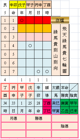 七層飛天祿馬貴統計表及天德、月德貴表解。福主辛卯,艮山兼寅,戊子年甲子月丙申日丁酉時,合連山歸藏艮卦山頭。