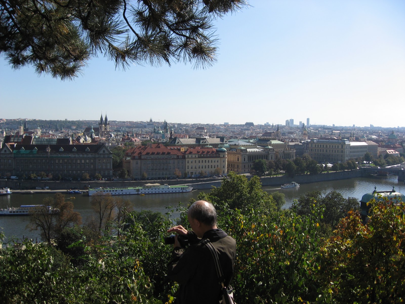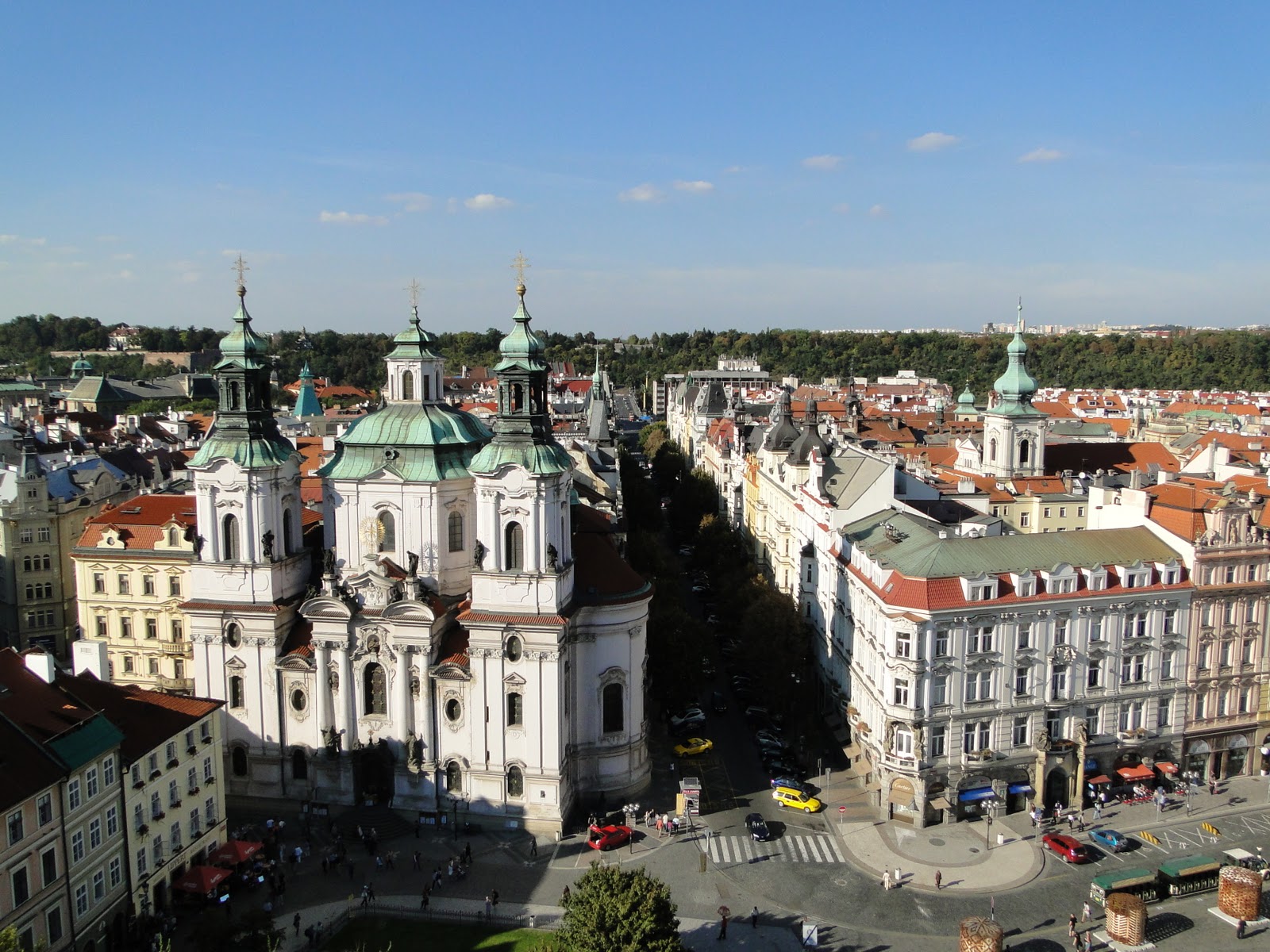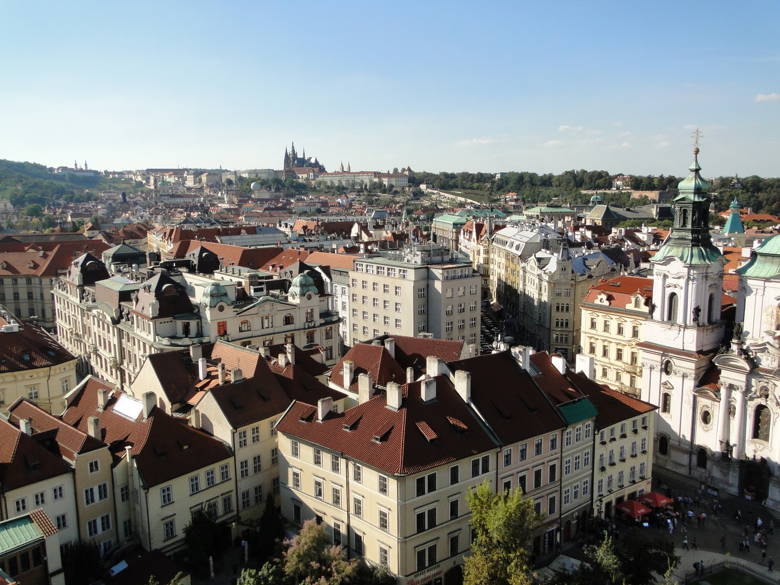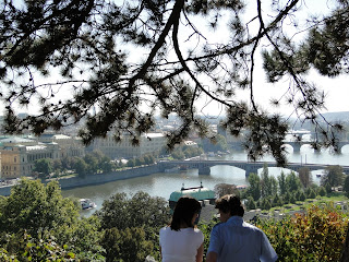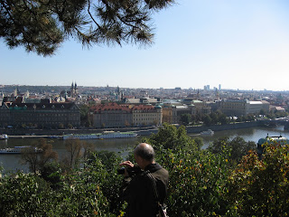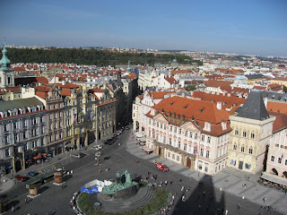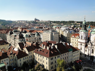 我們上了鐘塔,2哥說他沒有機會上去,所以我一定得上去,確實很直得。由鐘塔俯瞰布拉格,是一種壯觀的美,數大便是美的美。紅磚瓦色的屋頂圍繞著城鎮,遠處是清澈的綠山碧水。站在鐘樓頂,除了視覺上的饗宴,下午炙熱的氣候也在此處漂渺散盡,迎面而來的是徐徐的微風輕拂臉龐,清風徐徐而古香氣襲人,不是那鳥語花香,是那古老的氣味,將你帶領到幾百世紀前的遙想。一股氣味,百世流傳,傳承交替著一個城鎮,一個國度,一個種族的故事興衰變遷。